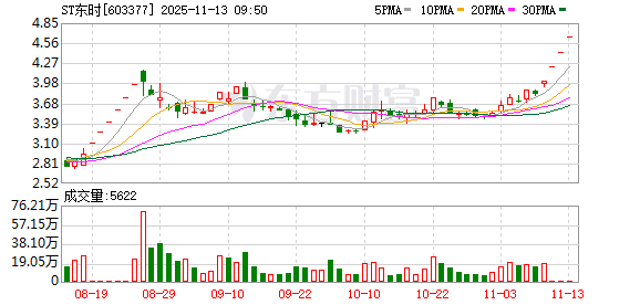 ST东时(维权)盘中涨停,已连收4个涨停板,截至9:25,该股报4.64元,换手率0.04%,成交量28.38万股,成交金额131.68万元,涨停板封单金额为8351.07万元。连续涨停期间,该股累计上涨21.47%,累计换手率为3.10%。最新A股总市值达33.17亿元。
